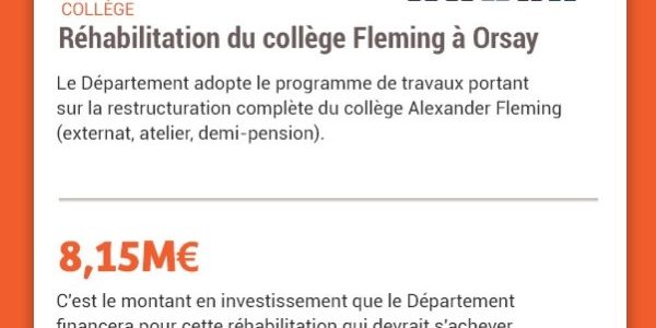 Souvenez-vous, en novembre 2015, nous avons dénoncé, suite au changement de majorité, le désengagement du Conseil Départemental pour la réhabilitation du collège Fleming à Orsay.