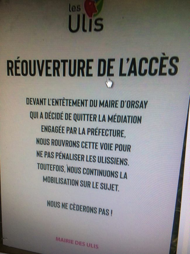Heureux dénouement dans l’affaire de la fermeture du passage entre les rues du Vaucluse (côté Ulis) et Alfred Pohu (côté Orsay Mondétour) : la mairie des Ulis a décidé de rouvrir le passage aux piétons. Nous nous réjouissons que la ville des Ulis ait pris notre questionnaire citoyen en considération et respecté l’avis des